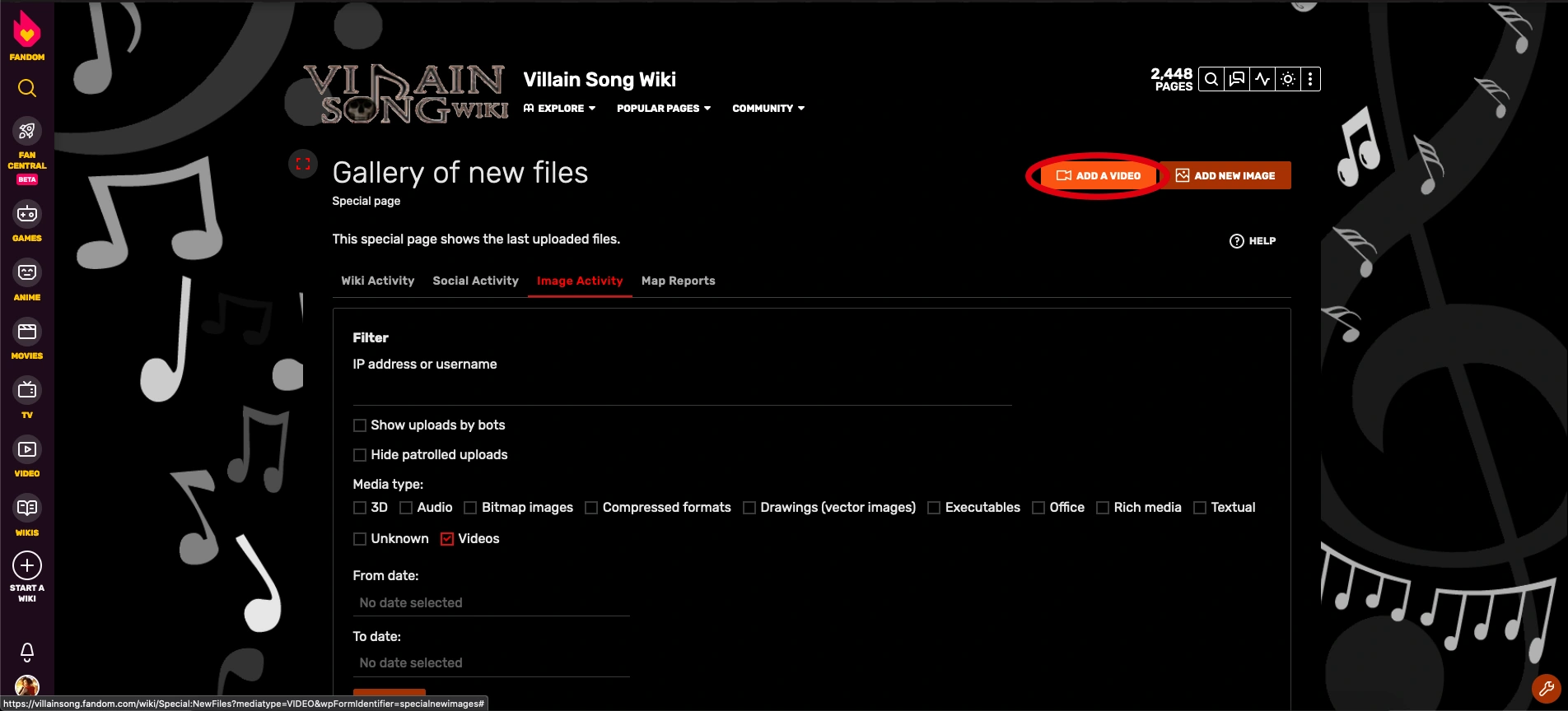 Go to the Villain Song Wiki and go to the tab named "Explore". On the dropdown, click either "Videos" or "Images" (they lead to the same place following the last MediaWiki update) OR search for Special:NewFiles. Here you will be able to view all the most recent uploads to the wiki.