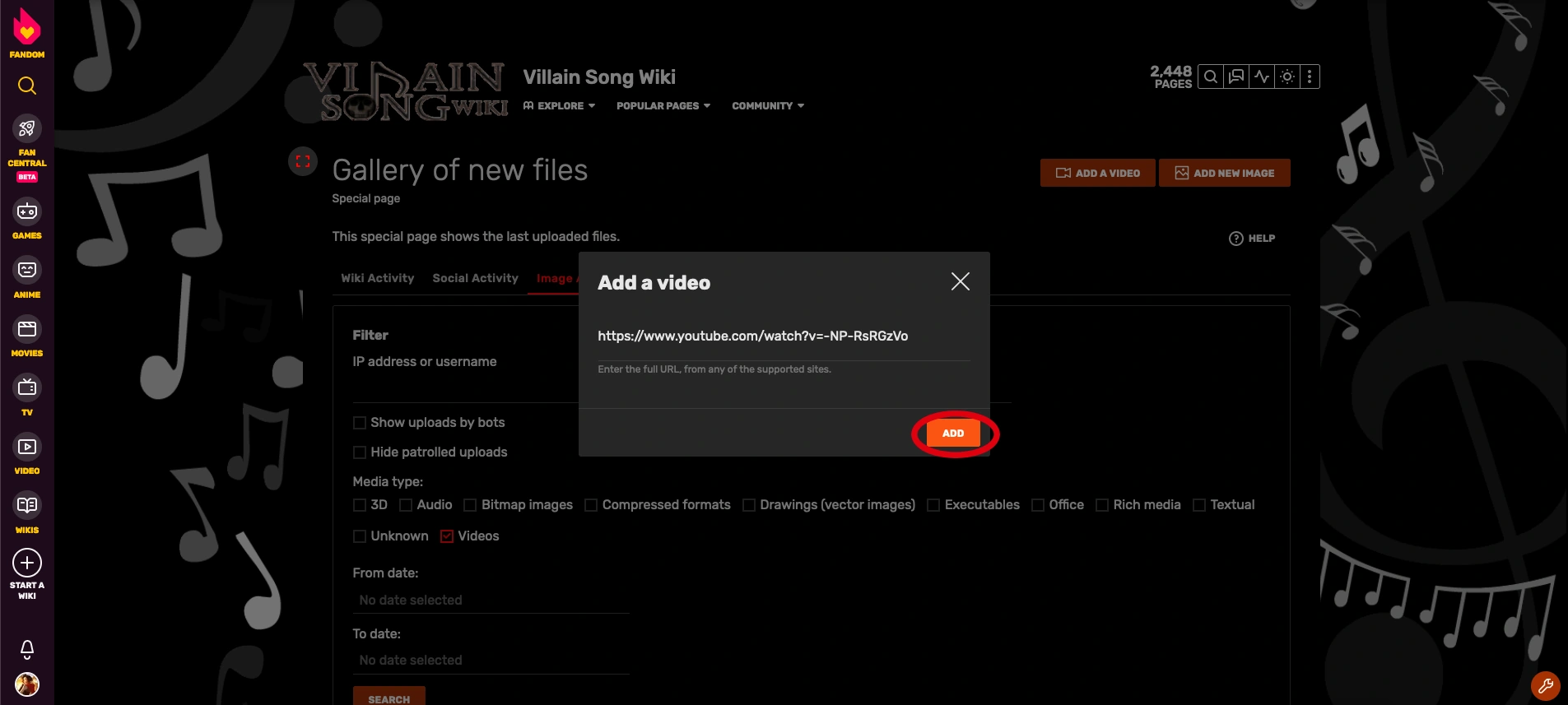 In the popup that appears, paste the FULL video URL in the space provided and click "Add". Your video is now added to the wiki's files. You may refresh or return to the New Files page to view it.